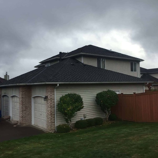 Earlier this week we completed reroofing this brick home in Seattle. The previous roof was over 20 years old and was ready to be replaced. She chose to replace her roof with CertainTeed Landmark Pro. The homeowner decided to change from a brown colored roof to a granite grey color with the new composite roof.