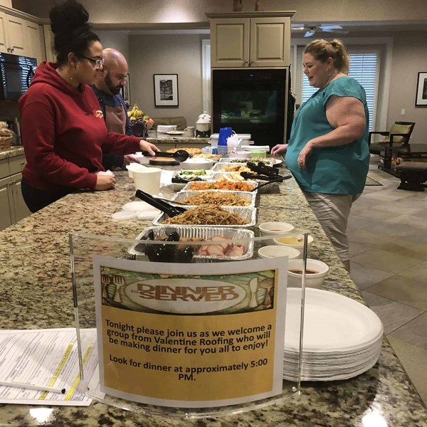 Valentine Roofing volunteers monthly at Fisher House to cook and serve dinner to the guests and their family that are staying on site. Fisher House offers a comfortable place to stay while veterans or their family members are ongoing treatment at the Seattle VA Hospital or Seattle Children's Hospital. Often these folks travel from out of state for treatment and don't have family close by. Providing a place for them to stay, along with a home cooked meal now and again can alleviate much of the stress and fear they are already going through.