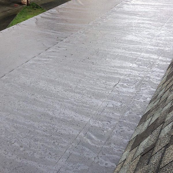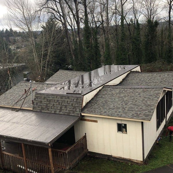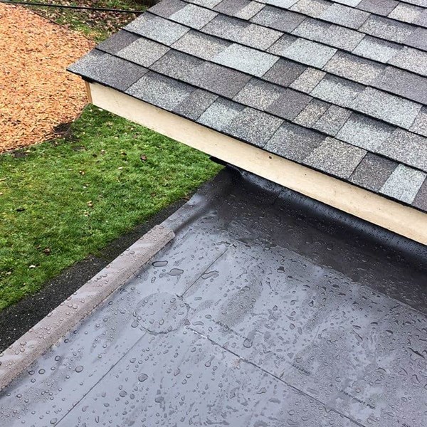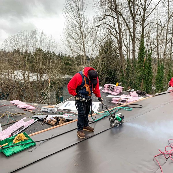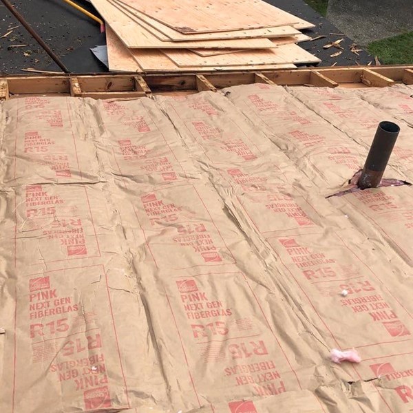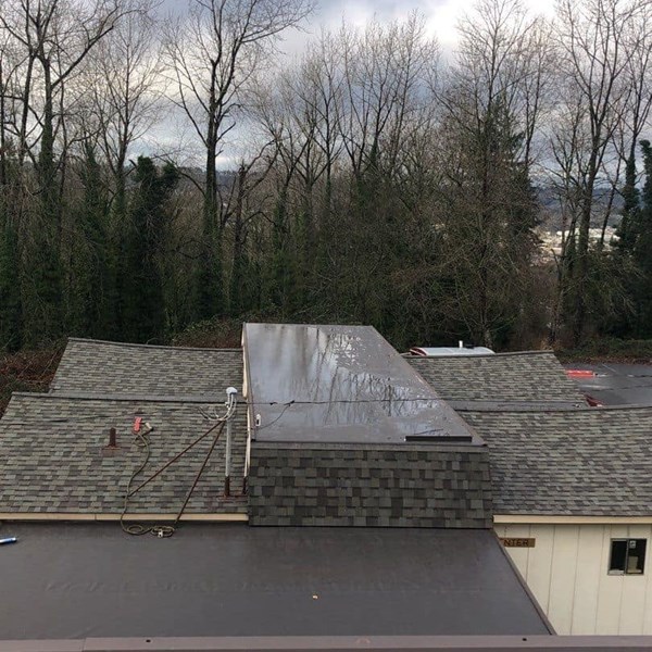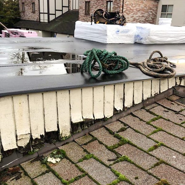 - PROJECT NOTES: New batt insulation was installed in the vaulted attic space before new plywood was installed. A combo roof system featuring composition shingles and PVC membrane was installed to best protect each roof facet using the appropriate material. The old gutter system was missing downspouts and pulling away from the building. We installed new fascia board as needed before installing the new gutter system.