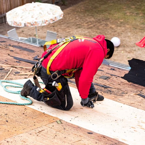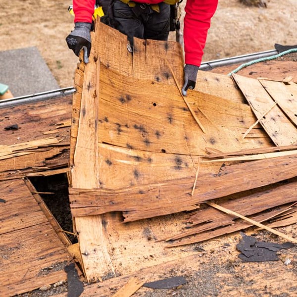 With all of the old roofing material removed, the crew set to work inspecting the condition of Dawn’s existing plywood. Knowing of the leak that occurred before in her roof, they looked for areas that were damaged by the water penetration. Several sections of plywood were splitting and separating. Those areas were replaced with new CDX grade plywood, giving the new roofing system a sturdy and solid surface for exceptional installation strength.