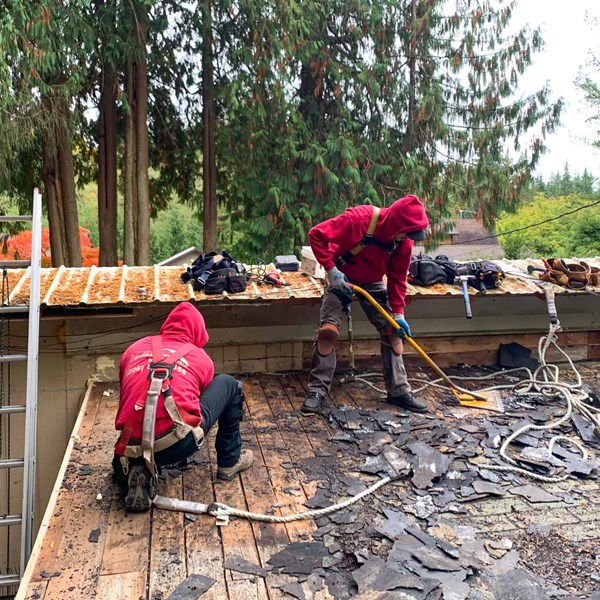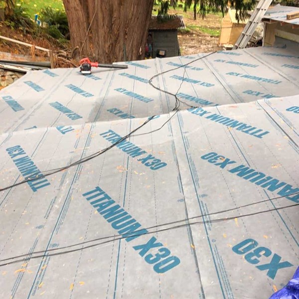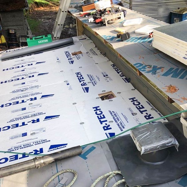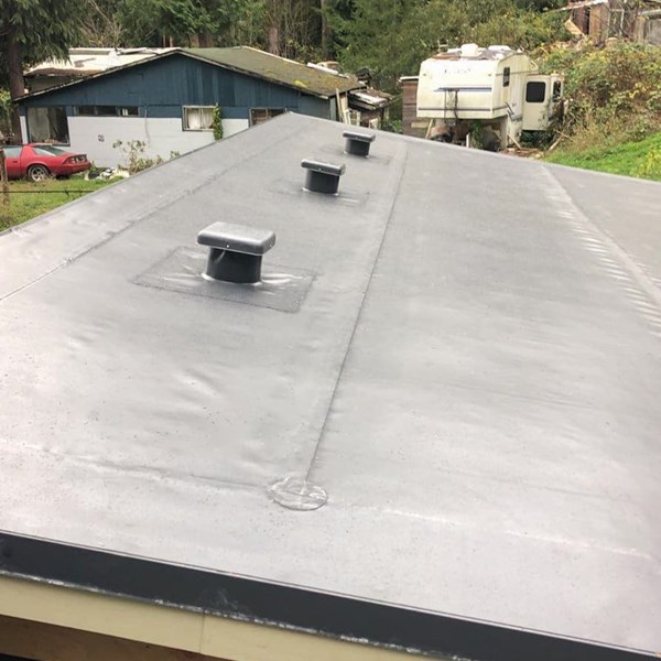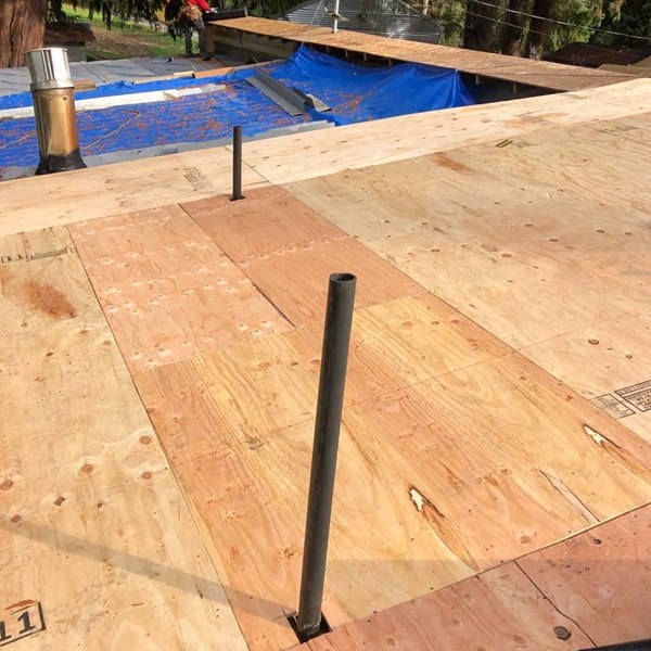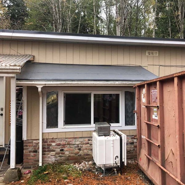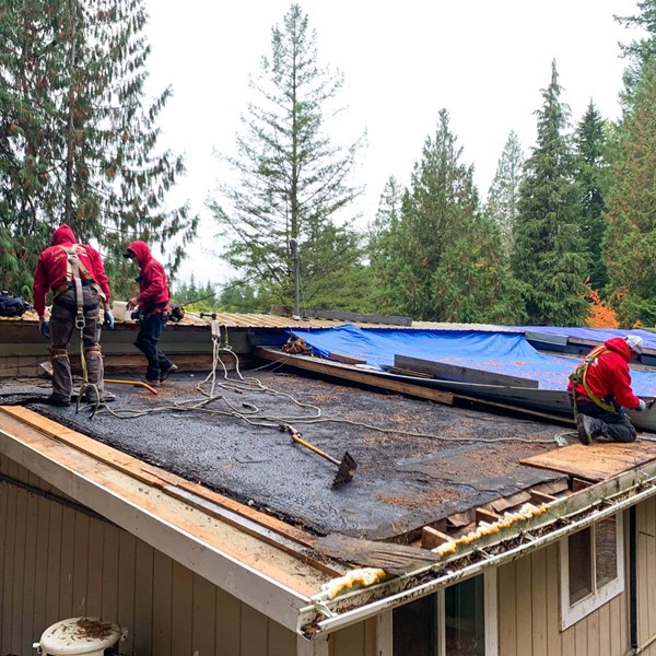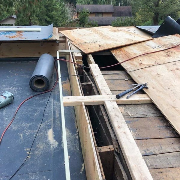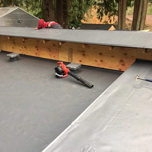 Knowing we wouldn’t be like other contractors that walked away when the family needed help most, our team put together a comprehensive project for the McBride family. A project that would address ALL the family’s needs. Like the roof leak, ensuring the right material was used to avoid leaks again in the future, and mitigating some of the mold issues in the home. We relied on the expertise of our partners at Mold Solutions Northwest to identify the root causes of the mold and create a comprehensive plan to reduce existing mold and avoid mold in the future. The plan included replacing compromised attic insulation, replacing affected areas of the roof deck as well as installing two new exhaust vents. The new vents will eventually hook up to interior exhaust fans in the kitchen and laundry space, moving moisture out of the home. Working with our local roofing supplier, Beacon Roofing Supply, as well as a FLEX®, a PVC manufacturer, we secured PVC membrane, along with matching accessories, to install the right roofing system for the McBride’s flat roof.