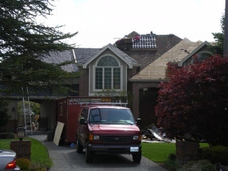 We are installing cedar shingles on a roof that was previously cedar shakes. This project is off 129th in Redmond. A lot of people think that shake and shingles mean the same thing but they don’t. They are both cedar, but shingles are 18? in height and are installed at a 5 1/2? exposure while cedar shakes are 24? in height and installed at a 10? exposure (Shakes can be installed at a 7? exposure also).