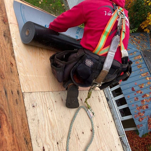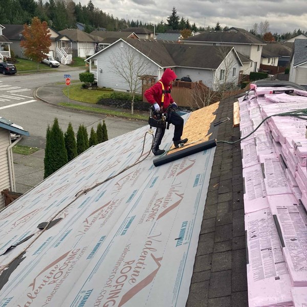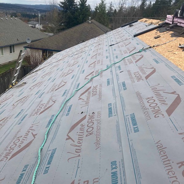 Safety is perhaps the most critical area of concern when it comes to cold weather roof installations. When working in near-freezing or sub-freezing temperatures, roof decking, underlayment, and other materials can become slippery and dangerous for roofers to walk on. The extra weight of tools, materials, and clothing can increase the risk of injury. With safety and efficiency being top of mind for our installations, we partnered with Owens Corning to develop a fully synthetic underlayment that is designed specifically for cold-weather roof installations and the Pacific Northwest region. Titanium X-30 by Owens Corning and Valentine Roofing provides exceptional cushion and traction underfoot during roof installation. Titanium X-30 enables crews to install materials more safely even in wet weather conditions. Unlike many other organic and hybrid underlayment options, Titanium X-30 will not tear or become unsafe to walk on in extremely cold temperatures. Because TX-30 rolls are nearly half as light, crews can work faster and more efficiently – shortening the roof installation time frame while keeping safety top of mind. Safety is always our #1 concern at Valentine Roofing. In addition to being equipped with the best materials for cold weather roofing installation, our roofing crews are always outfitted with all necessary safety equipment to ensure they are fully protected throughout the season. Safety harnesses, PPE, and continued training are just a few key ways we protect Valentine Roofing employees on the job.