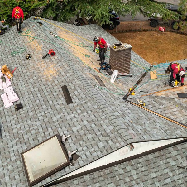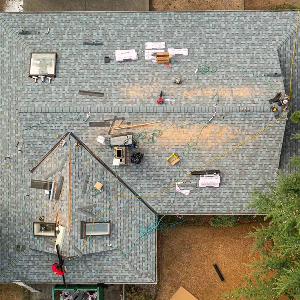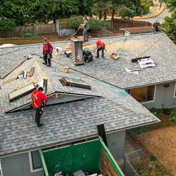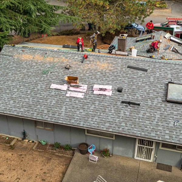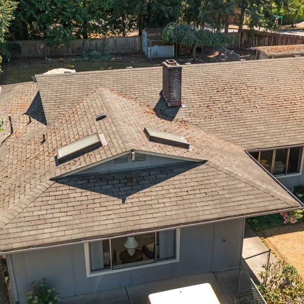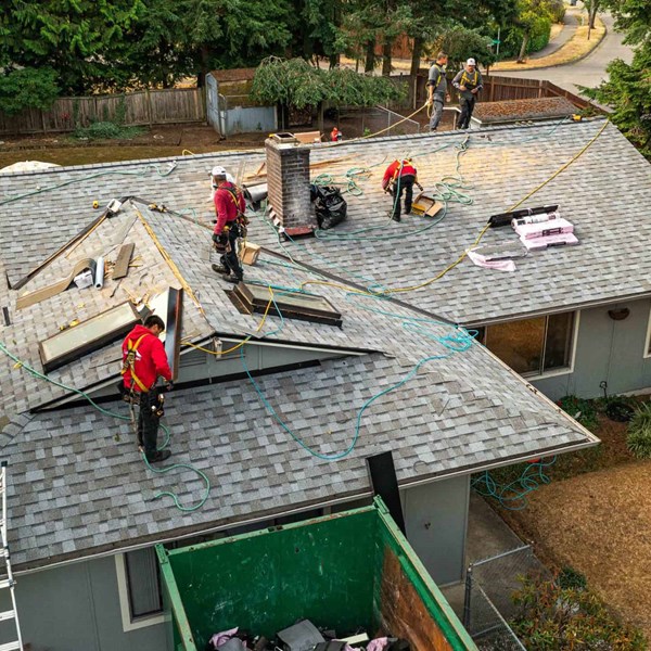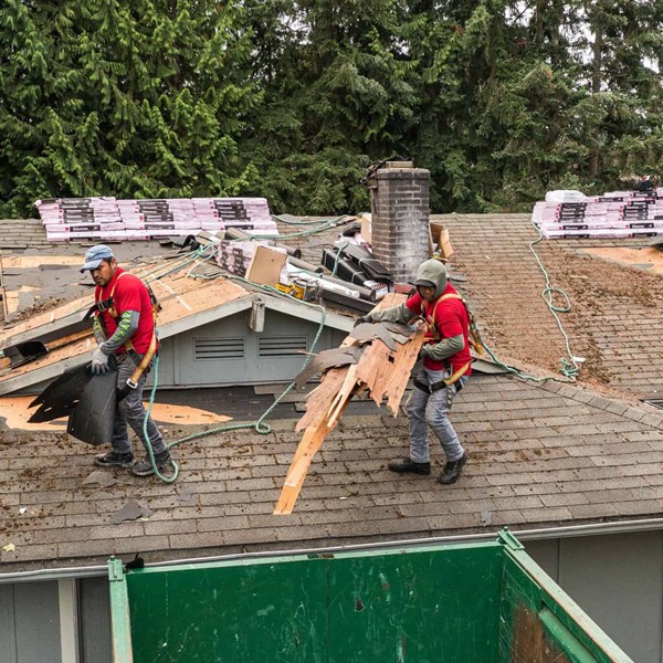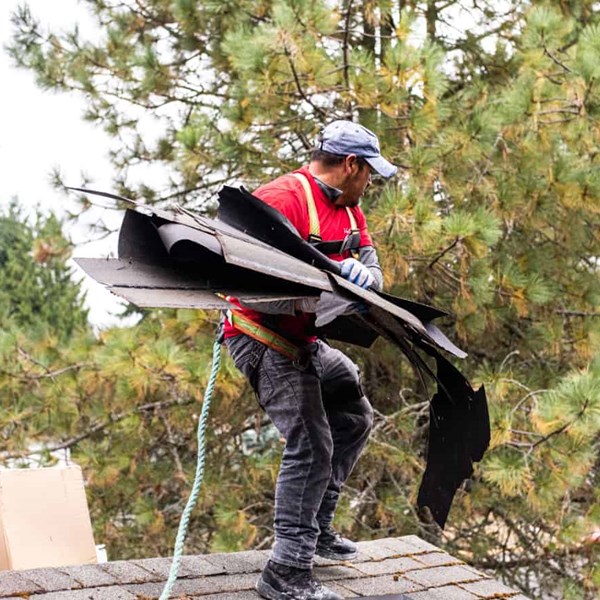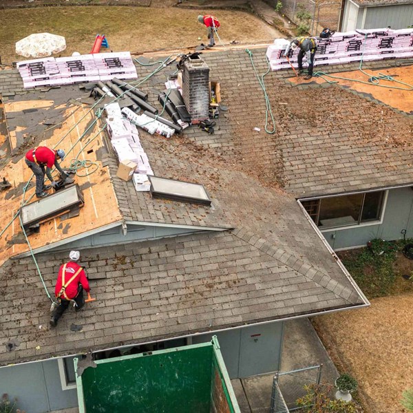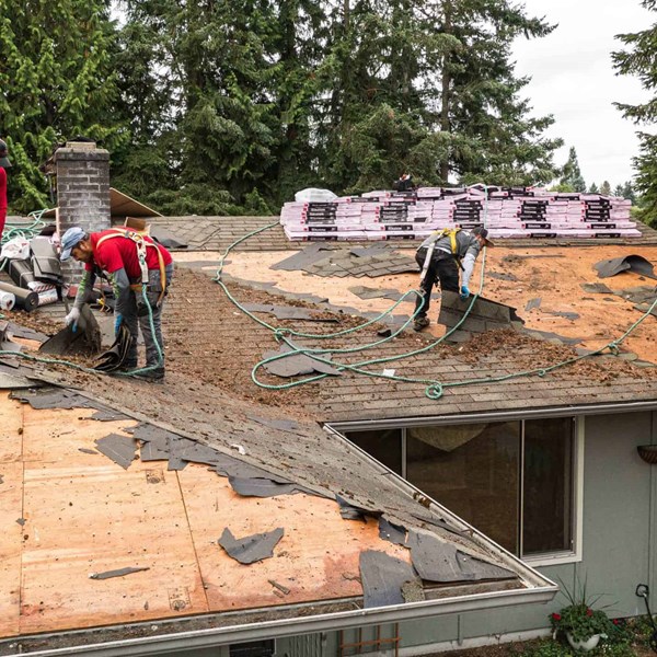 The crew got right to work tearing off the old roofing material. The shingles on Dawn's old roof were worn from the elements, with visible moss growth and granule loss. This old roofing material was completely removed and placed into the dumpster. Our partners will recycle some of the old shingles and other eligible materials.