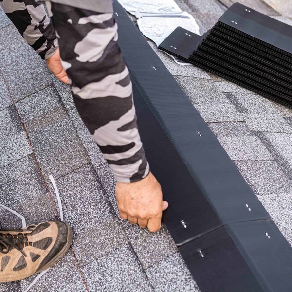 Eliminating the outdated box vents that were previously on the roof, the crew cut open a new ridge vent today. This new system provides better airflow through Dawn's attic space. Ridge vents also provide a sleek look to any roofing system.
