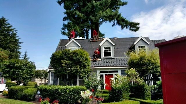 We are in the process of installing a new composite roof on this home on Mercer Island. As you can see from the picture there is a rather steep pitch to this roof. Our crew members are taking extra safety precautions by using toe boards in addition to their safety harnesses. Valentine Roofing takes great precautions to ensure the safety of our crews.