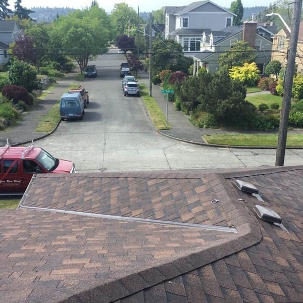 We recently completed a re-roofing project for our customer in Seattle, WA. Our customer had a 20 year old composition roof that needed new life. Our sales representative went over several options for this home, including color options that would make the mid century brick on her home really pop. After reviewing her options, our customer chose the Owens Corning Duration shingle in Brownwood. Brownwood is a beautiful, rich tan and dark brown shingle.