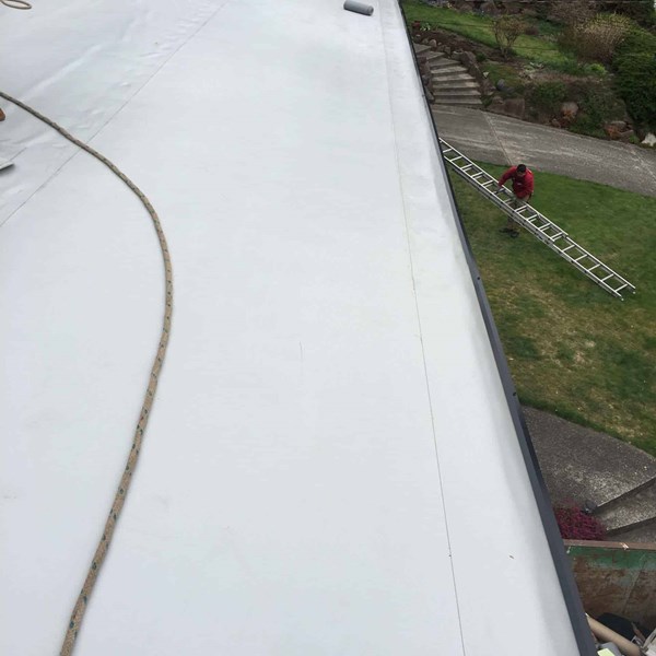 Earlier this month we installed a new PVC roof on this home in Shoreline. Our customer previously had a torch down roof that he wanted to change to something with a longer lifespan. After meeting with our estimator he decided to change to a PVC roof in light gray.