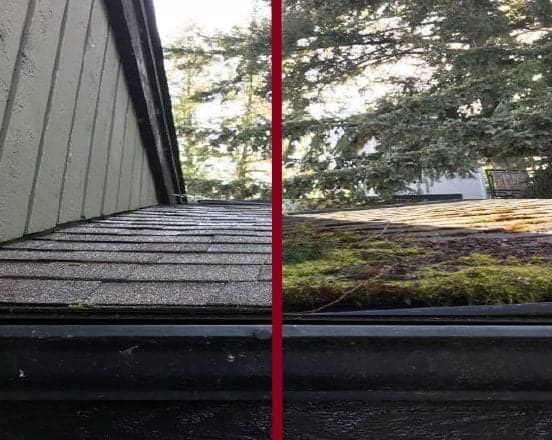 Existing moss is agitated with a wire brush which will physically remove over 80% of the existing moss. Then we will blow off the moss and roof debris followed by cleaning out any open gutters and downspouts.