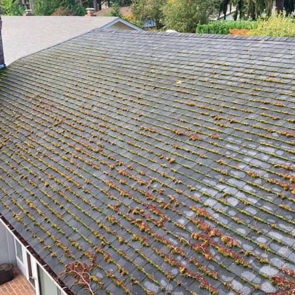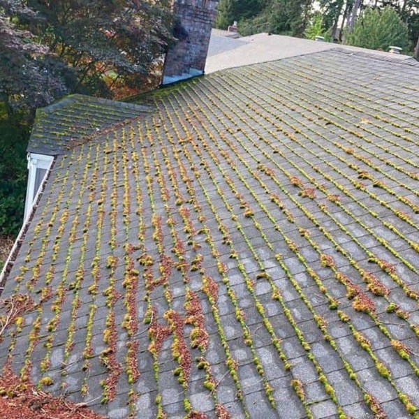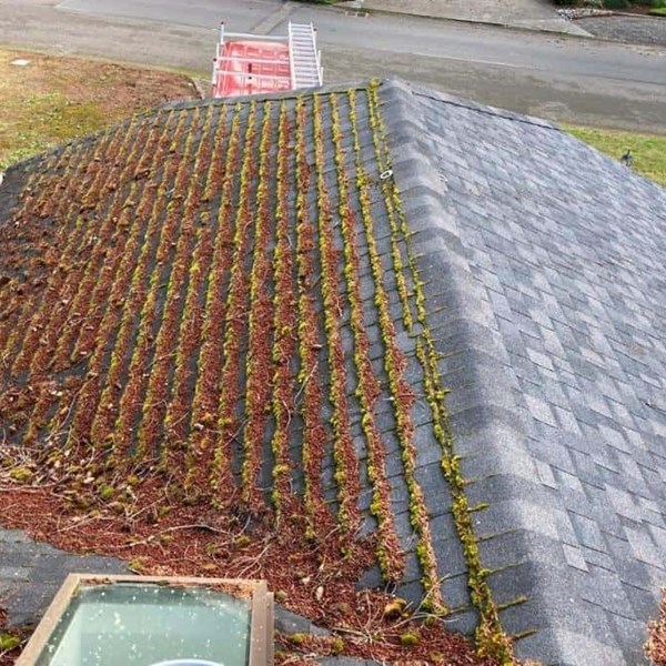 The Swanson’s gutters and downspouts were full of leaves, needles, and pollen cones which were blocking water from flowing efficiently. Overflow and backups often lead to damaged roof decking, siding, landscaping, and even a home’s foundation. Clear gutters and downspouts ensure water flows efficiently and defends against damage to your home. To prepare the Swanson’s roof for fall and winter weather, our roof maintenance technician first inspected their roof for any signs of leaks, penetrations, or areas of concern. The 8-year-old composite roof is still performing beautifully and looking fantastic once clean. Moss and algae were removed by gently agitating and scrubbing with a roof brush which safely removes plant growth without damaging asphalt shingles, metal panels, or PVC membrane.
