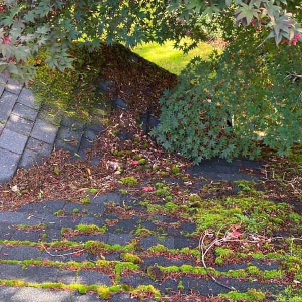 Our team recently helped the Swanson’s get their composition roof ready for the fall/winter months with an annual roof and gutter cleaning service. After a year of rain and wind, it was apparent that moss and algae had begun to form on and around the composite shingles on the Swanson’s roof. Moss and algae growth can disrupt and lift shingles, allowing water to find its way in. If moss and algae are left unmaintained, they will continue to grow and can cause irreversible damage to your roof material, decking, and more. Keeping your roof free of these will prevent premature aging of materials and an early roof replacement due to a leak or failure. Sticks, pine cones, and needles had also accumulated on the Swanson’s shingles and begun to form a layer over the moss growth, especially in areas with dense tree coverage. When plant debris accumulates for a prolonged period of time shingles and other material layers can become saturated with moisture, leading to leaks and water damage to roof decking and more.