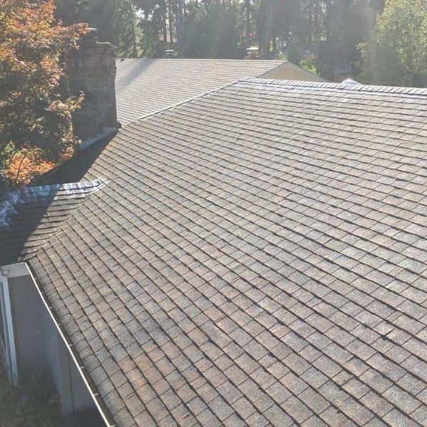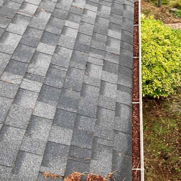 In this case, the Swanson’s seamless aluminum gutters were still performing flawlessly once cleared of debris. A moss killing and preventative treatment was then applied to the Swanson’s shingles, covering critical areas like the ridges, hips, saddle, and valleys. Once the treatment is applied, a white powdery coat will be seen over areas of the roof, until rain carries it down the roof covering the shingles as the treatment mixes with rainwater over time.Many Pacific Northwest roofs are in excellent condition but are in need of routine cleaning and annual maintenance to ensure their long term efficiency and longevity for the years to come.