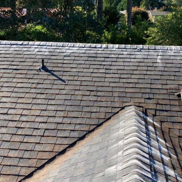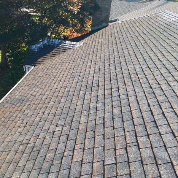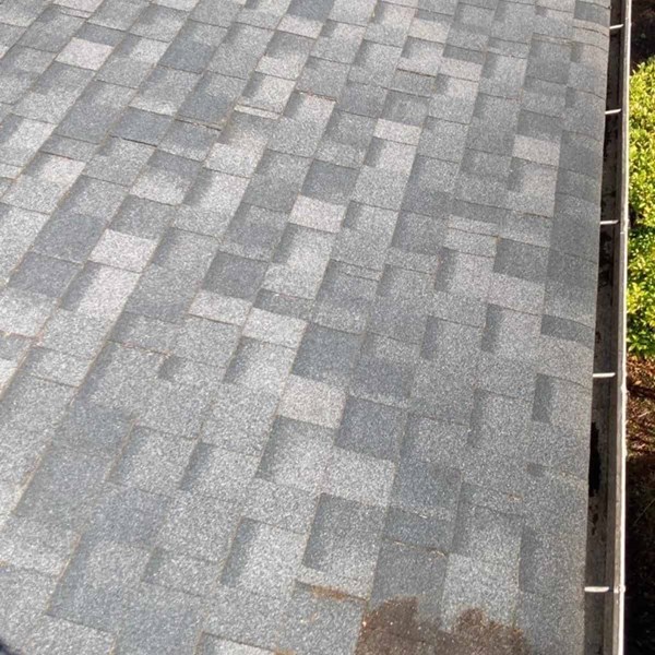 Some roofers will use a pressure washer to clean a roof and in turn cause severe and irreparable damage and premature aging. Pressure washing a composition roof removes shingle granules, can cause shingles to lift resulting in leaks, and essentially shortens the lifespan of your roof. Once any organic growth and plant debris were removed, pressurized air was used to blow off any remaining organic matter and debris. Once the roof has been fully cleaned, gutters are cleared of any and all leaves, pine needles, and pollen cones. All downspouts were then checked and cleared of blockages that could cause backups and overflow. If there’s any pertinent damage, it's recorded so that recommendations can be made if a repair or replacement of the home’s gutters is needed.