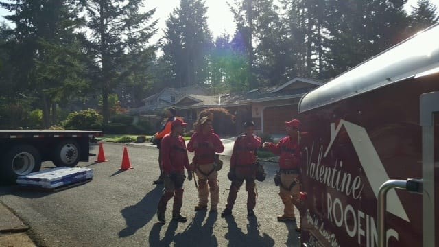 While the materials are being delivered our crew is having a jobsite safety meeting. This insures that no one is under the boom (where materials could possibly fall on them) or obstructing the view of person operating the machinery. Safety is extremely important to us here at Valentine Roofing. Once materials are loaded on the roof the work resumes.