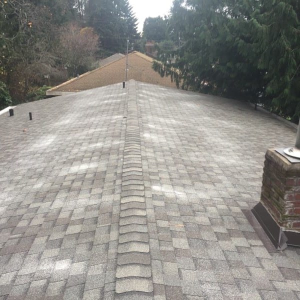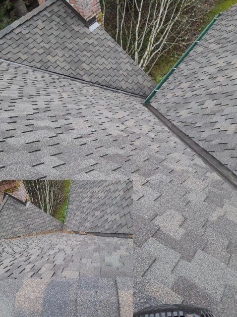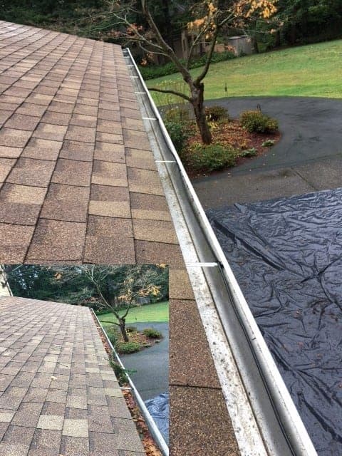 Step 1: Blow debris from roof and gutters- The best way to remove debris from the roof and gutters without causing damage is to use air and blow the debris off of the roof. High pressure systems can cause granule loss, broken shingles and damage to gutters.