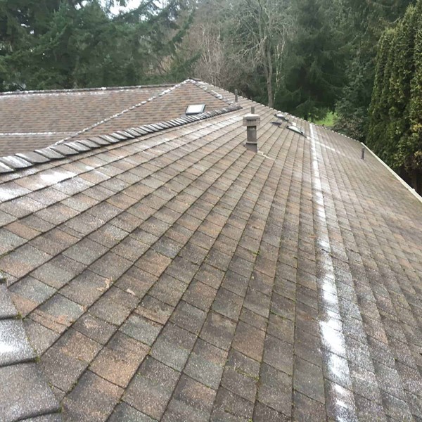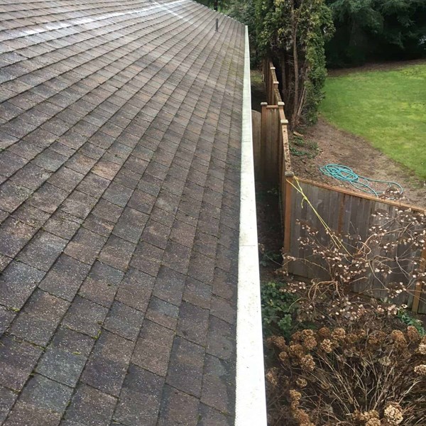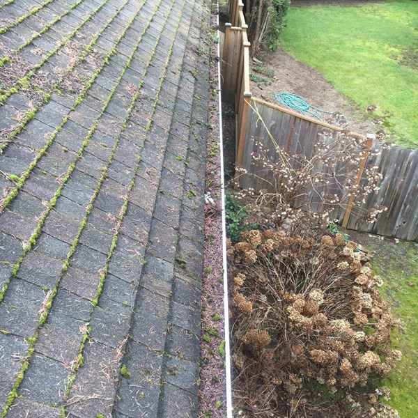 The best way to properly clean your composition roof is to gently agitate existing moss to result in about 80% physical removal of moss. A non pressurized air system can be used to remove agitated moss along with other roof debris, such as leaves, small sticks, needles and more. Don't forget to remove debris and build up from the gutter system as well to prevent a back up of water and leaking into the home.